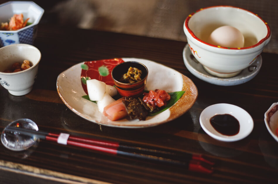 散歩から戻ると、ほかほかの朝ごはんが待っていました。土鍋で炊いたごはんに、きのこ汁。赤ずいきやカブ、梅干しなどのお漬物セットだけでごはんをモリモリいけますが、他にもイワナの一夜干しやニジマスの昆布〆、自然卵で卵かけごはん……おかわりが止まりません。