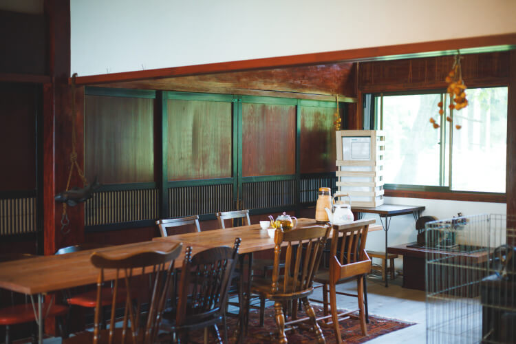 古民家の素朴な雰囲気が生かされた和洋折衷のカフェスペース。