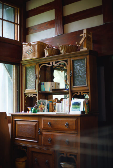 西洋のアンティーク家具が古民家に調和し、魅力的なインテリアに。