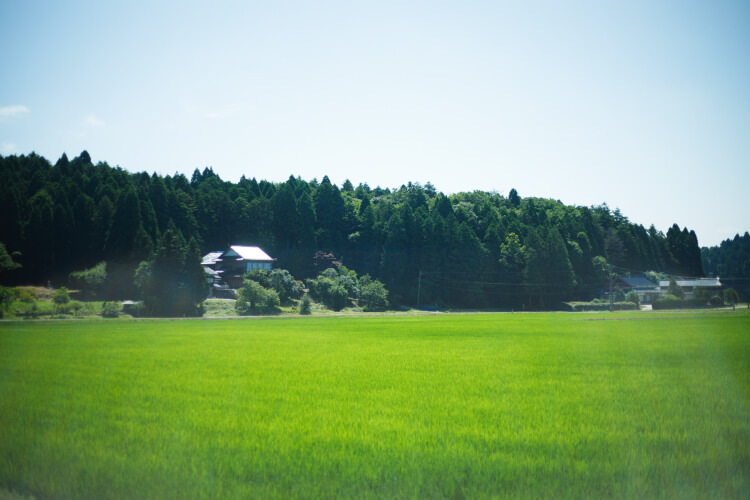 田んぼが広がる“のとくまの”の風景。日当たりのいい場所は田んぼに譲って、森のそばに民家が点在する。