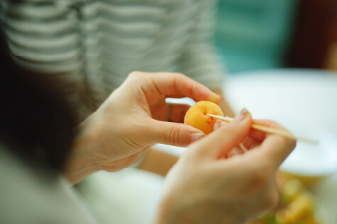 竹串を使ってヘタをくり抜き、エキスが出るように実をチクチク刺す。