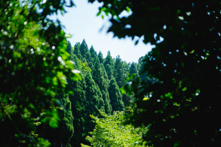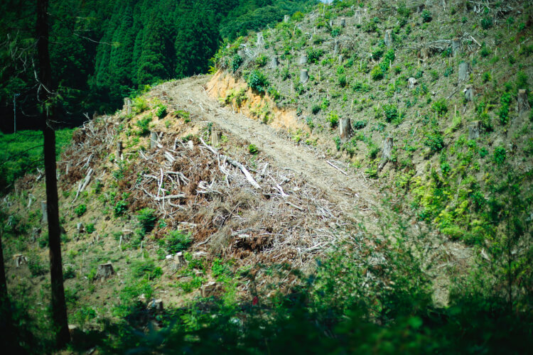 「苗木があるのが見えますか? この斜面はちょうど先日、植林を終えたところです。野菜と同じように、木も育ててから伐採して出荷し、また次の苗木を植えなければいけません。ところが、日本の多くの山では、安い外国産材に押されて林業が成り立たなくなり、山の手入れをしなくなり、何百年も続いていた森林サイクルがストップしてしまいました。手入れをしていない山ばかりになってしまい、CO2を吸収するどころか、逆に吐き出している状態です。木の需要もないので、そのまま放置されたままなんです」と大瀧さんは話します。木がたくさんあって緑が豊かでいいとか、はたまた、木がなくなっていいというわけではありません。山を見て、そんなふうに単純に考えてはいけないのです。