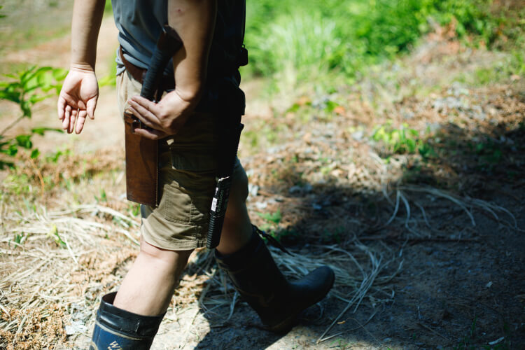 ナタやノコギリなどの道具を装着して、いざ森へ。