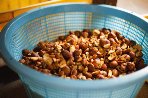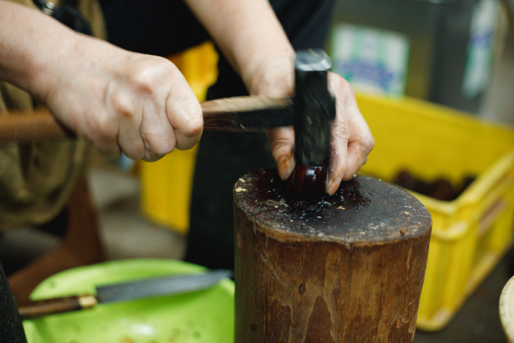 栃の実の硬い皮を金槌で叩き割って中身を出す作業。1個ずつ、1個ずつ、ひたすら地道な作業。