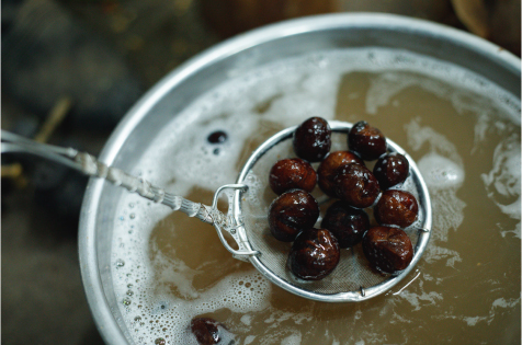 乾燥させた実を一晩お湯に浸けて、翌日に皮を割る。