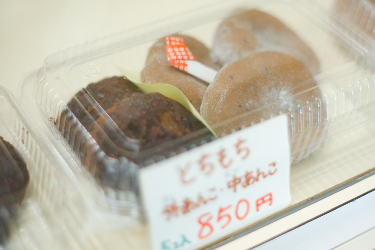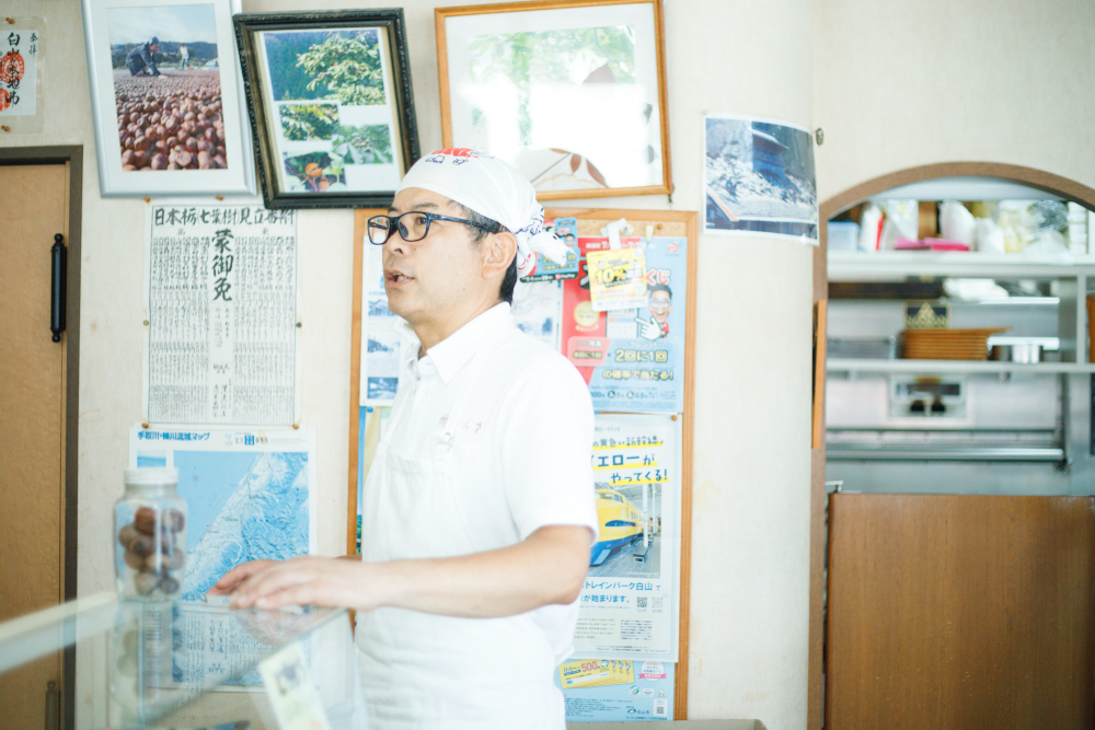 山口さんがおすすめのスイーツがあるというので、『白山栃餅 志んさ本舗』へやってきました。栃の木の実から作るお餅、栃餅です。白峰の周辺には栃の木が多く、9月になると実が豊富に採れます。平地の少ない白峰に稲作は向いておらず、お米は大変貴重でした。代わりに栃の実をお米などの主穀に加えてかさ増しする食文化が発達し、かつて栃餅は白峰の各家庭の日常食でした。