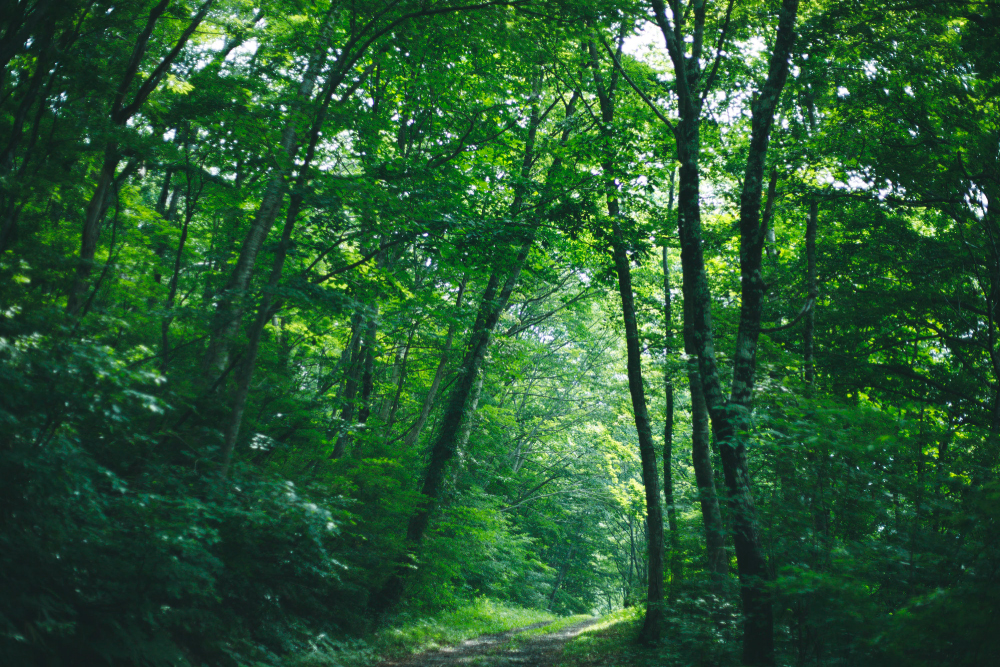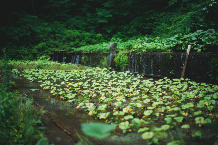 「お昼ごはんを食べに行きましょう」と、山口さんと車で向かったのは白山の登山口の一つ別当出合。標高1000mほどのところで脇道に逸れ、ブナ林のトンネルを抜けて行きます。たどり着いたのは、わさび田です。