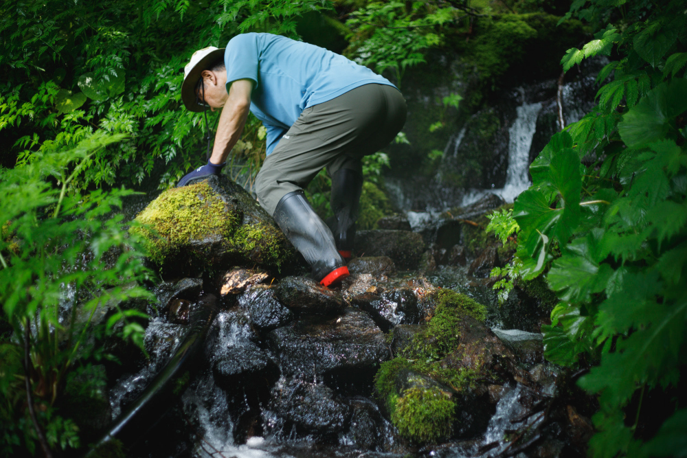 ここは、白山の山頂、御前峰に積もった万年雪が解けて大地にしみ込み、長い年月をかけて湧き出す場所です。「御前の雫」と呼ばれるその湧水は清洌そのもの。沢の水をすくって飲んでみると、まろやかで、すーーっとカラダにしみわたっていくような心地よさを感じます。
