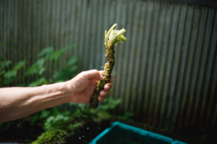2年以上かけて育てたわさび。茎に近い頭の方が辛味が強く、先に近くなるほどやさしい風味になっていくという。