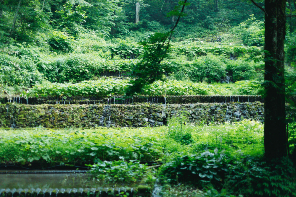石垣によって段々に整地した緩やかな傾斜地を利用する地沢式栽培のわさび田。年間を通じて冷たい湧水が絶えず流れる。