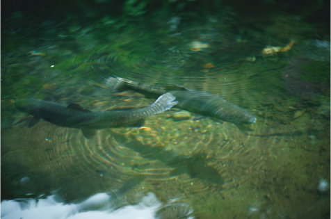 わさび田の一角でペットとして飼っているイワナ。水がいいからだろうか、50cmクラスに育ったものもいる。