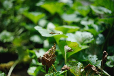 わさび田の周りには野生のフキや紫陽花が生い茂り、トンボやチョウチョが飛び交う。