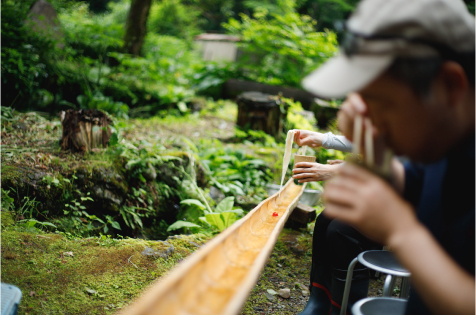 お待ちかねの昼ごはんは、なんと流しそうめん。白山の霊水「御前の雫」で流します。しかも、おろしたてのわさびを薬味に入れて……青空の下、白山の恵みをまるごといただくような、最高の贅沢です。