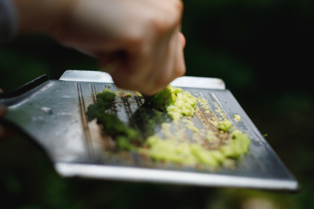 新鮮なわさびをおろしたてでいただく。爽やかな香りが鼻に抜け、余韻に甘みを感じる。