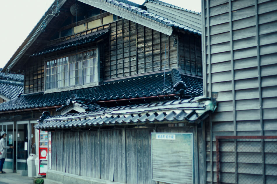 黒瓦の屋根も蛸島の街並みの特徴。銭湯だった建物をふと見上げると、一見鬼瓦と思いきや、恵比寿様が。